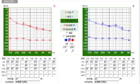 刘阿姨在医院做了听力检查,平均听力在50dB,我们还是给刘阿姨做了详细的检查,双耳平均在48dB属于中度听力损失。语言分辨能力80%。