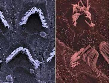 说完传导性耳聋,我们来说说感音神经性耳聋,我们接触的患者中,有将近90%的患者都是感音神经性耳聋。这种听力损失是耳蜗或者听神经受损造成的。比较常见的有噪音导致的,以及人体自然衰老造成的。耳蜗内感知声音的毛细胞一旦受损,就是一种不可逆的损伤,目前的医疗技术水平还无法修复,人体自身也无法再生听毛细胞来替代损坏的毛细胞。我们可以通过下图看看正常的毛细胞和受损的毛细胞: