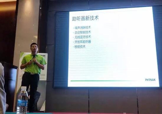瑞士峰力西南区销售经理龙云峰先生给在座的各位听障患者及验配师们讲解峰力公司发展历程。