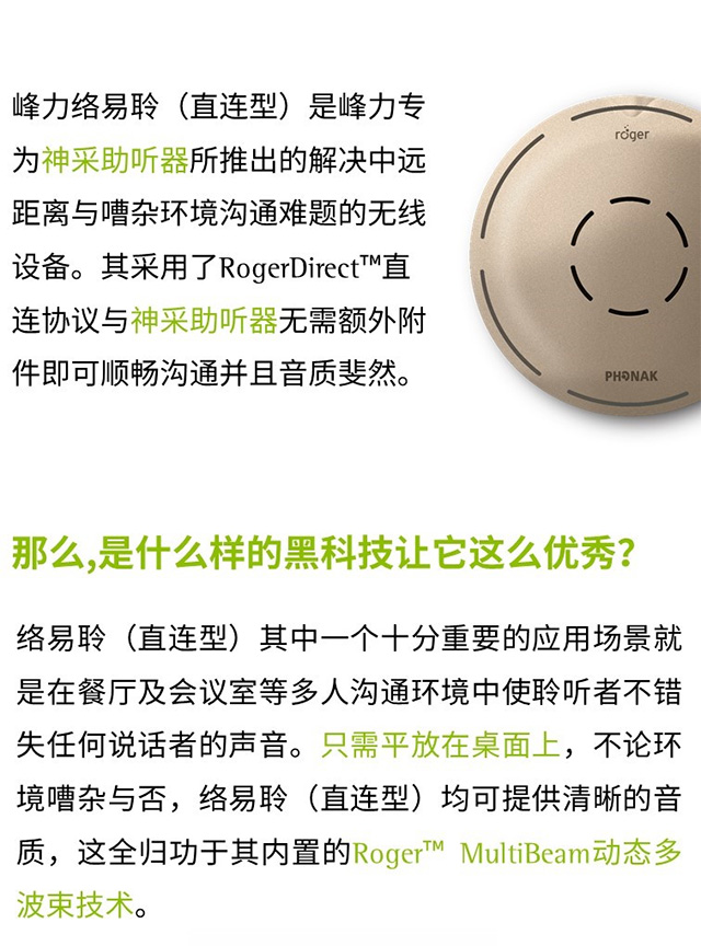 耳听八方|峰力络易聆(直连型)黑科技大解析 一 导读:峰力络易聆(直连型)是峰力专为神采助听器所推出的解决中远距离与嘈杂环境沟通难题的无线设备。其采用了RogerDirect直连协议与神采助听器无需额外附件即可顺畅沟通并且音质斐然。 相关文章:【专家说】「万元之下助听器,就选Siya」只是一句口号吗?相关文章:峰力络易聆直连型-工作,耳听八方