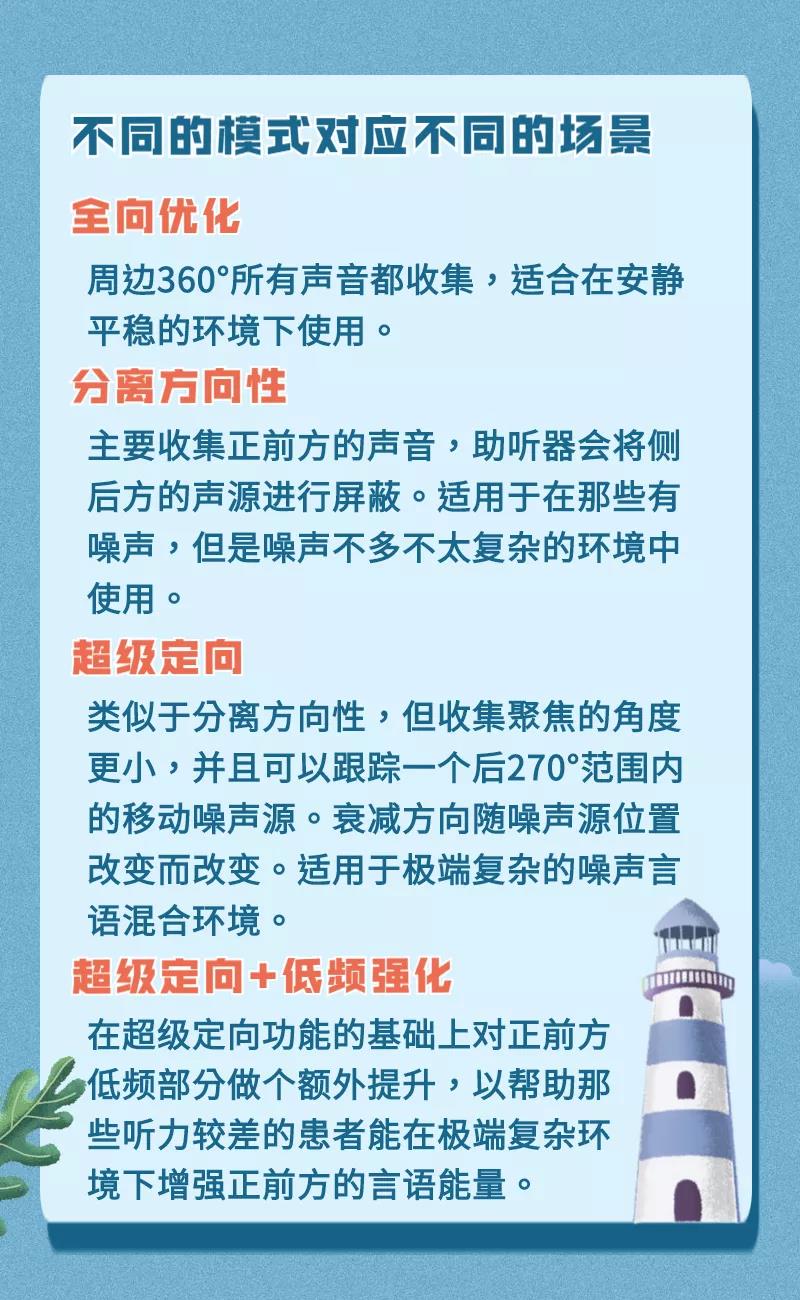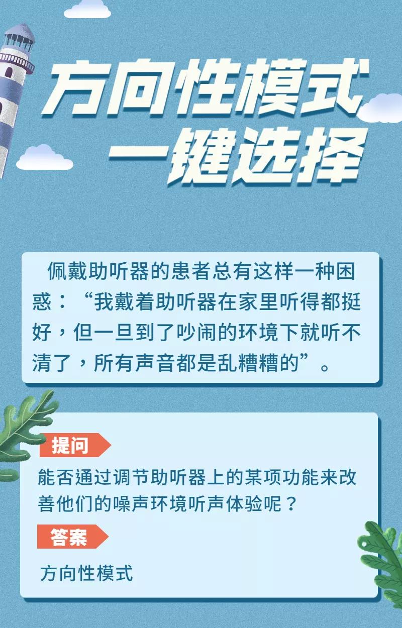 听力小课堂|一键选择助听器方向模式 导读:佩戴助听器的患者总有这样一种困惑:“我戴着助听器在家里听得都挺好,但一旦到了吵闹的环境下就听不清了,所有声音都是乱糟糟的”。提问:能否通过调节助听器上的某项功能来改善他们的噪声环境听声体验呢?答案就是:方向性模式。 相关文章:经典问答|助听器会不会越戴越聋相关文章:经典问答|助听器没有声音怎么回事