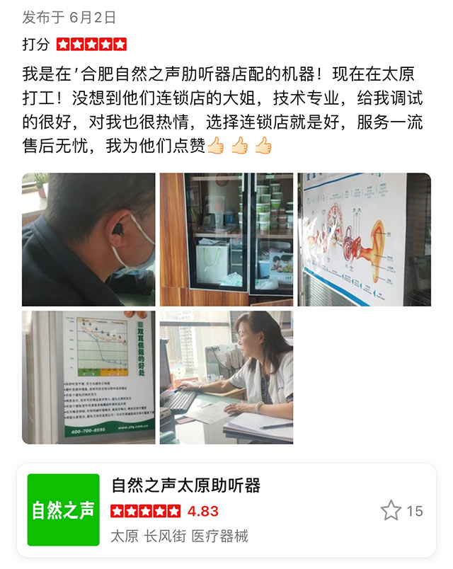 合肥用户评价|选择自然之声助听器连锁店就是好,服务一流,异地工作有保障 导读:我是在合肥自然之声肋听器店配的机器!现在在太原打工!没想到他们连锁店的大姐,技术专业,给我调试的很好,对我也很热情,选择连锁店就是好,服务一流售后无忧,我为他们点赞。 相关文章:听力学前沿 | 基于脑聆听概念的全新助听器解决方案相关文章:北京双井店用户评价|自然之声助听器的老用户,感谢店里的贴心服务