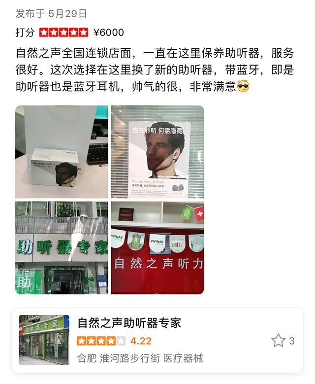 合肥用户评价|被自然之声感动,换新助听器我选择自然之声 导读:自然之声全国连锁店面,一直在这里保养助听器,服务很好。这次选择在这里换了新的助听器,带蓝牙,即是助听器也是蓝牙耳机,帅气的很,非常满意的。 相关文章:预告 | 2021峰力助听器全国路演活动相关文章:宁夏海原县用户评价|以前戴助听器也听不清,现在非常感谢自然之声解决了我的问题