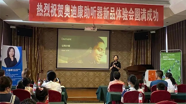 随后,奥迪康培训部王春晖老师为大家介绍了戴蒙特集团的发展进程和公司经营品牌,并生动讲解了奥迪康独有的脑聆听及360°开放声音领航系统的性能优势。