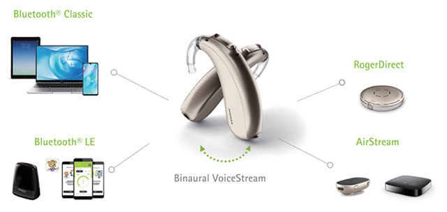 峰力使用了索诺瓦研发的直连芯片,搭载多种蓝牙协议,包括经典蓝牙A2DP协议(用于流媒体音频传输), HFP协议(用于蓝牙免提通话),AirSteams协议(用于看电视与蓝牙直连麦克风),BLE(用于无线编程与app),络+直连协议(用于使用中远距离强噪声环境的络+设备使用),BVST双耳语音互传协议。